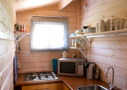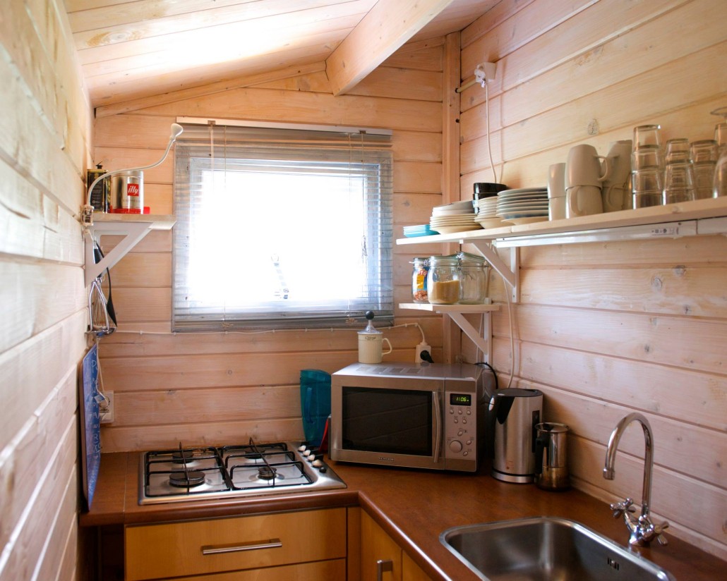 Zelf kokkerellen kan in het kleine keukentje met daarin een 4-pits gaskookplaat, een electrische oven, een Air Fryer en een koelkast met vriesvak.