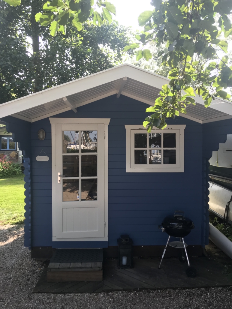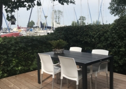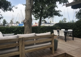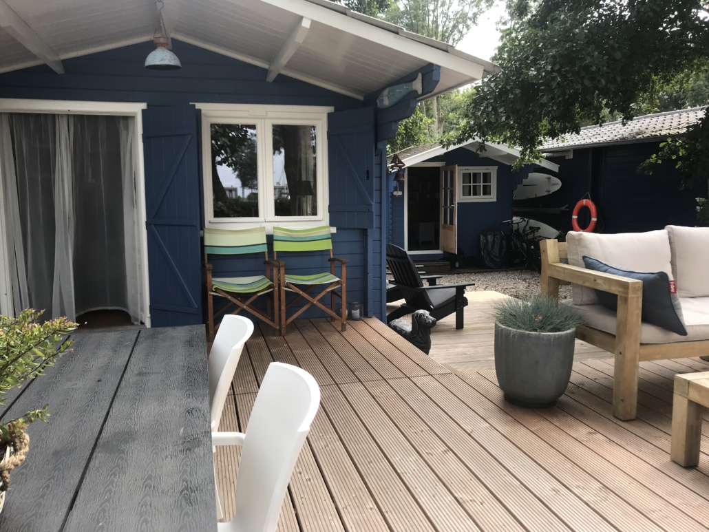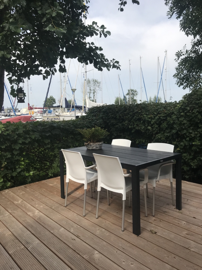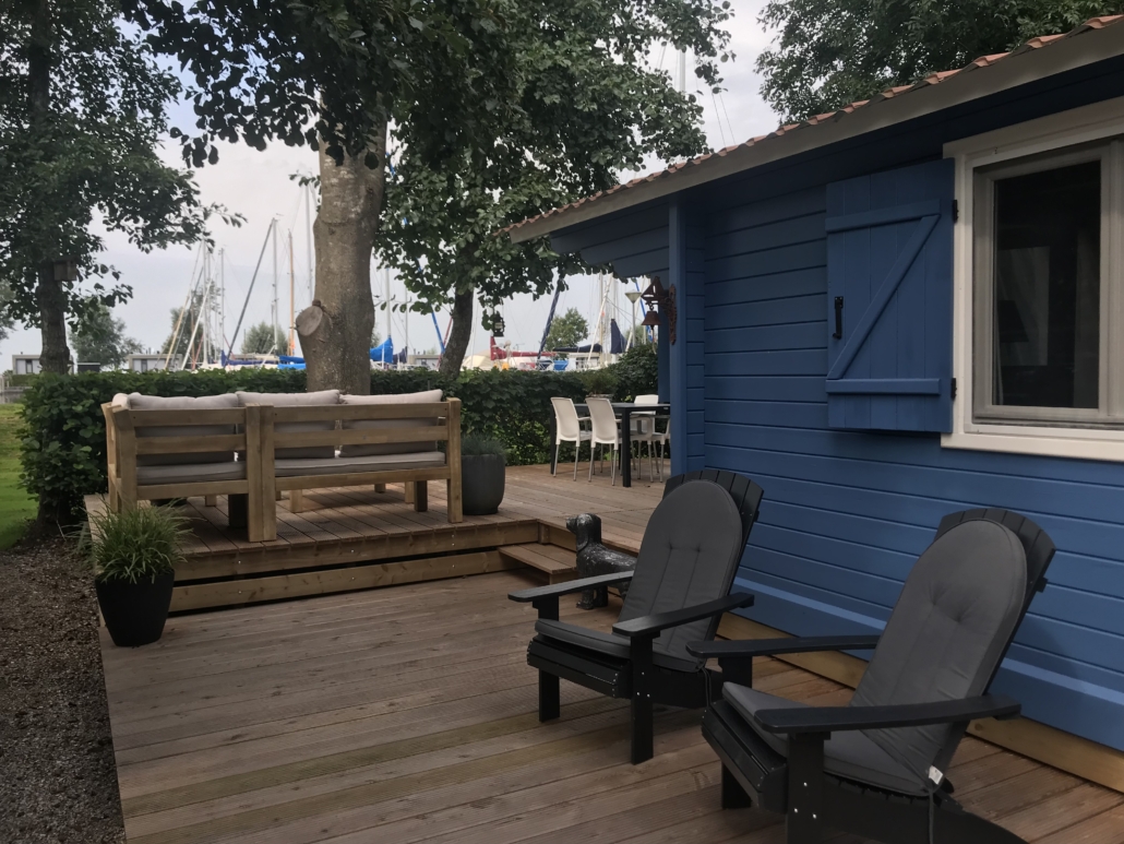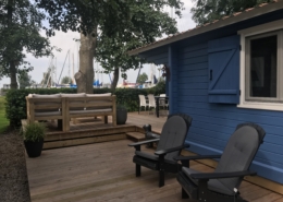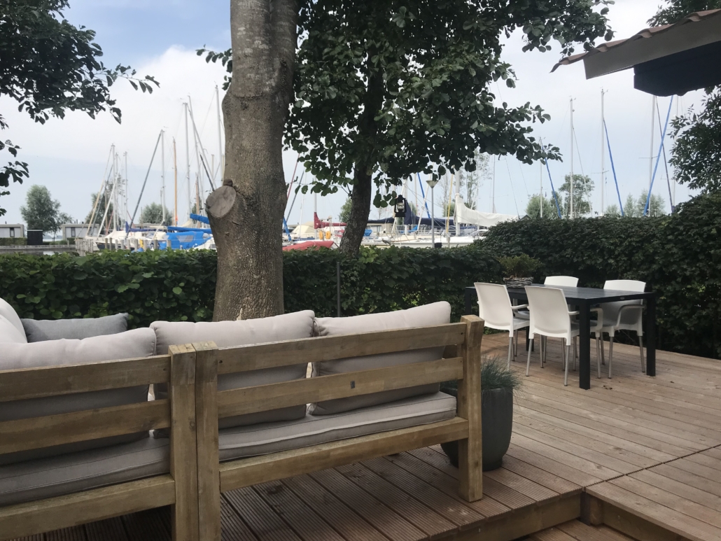 Voor het huisje is een groot terras met uitzicht over de haven en het meer. Daarnaast is er een terras aan de zijkant van het huisje. De terrassen zijn voorzien van een loungebank, terrasstoelen en een eettafel met 4 stoelen. Er is een BBQ aanwezig.