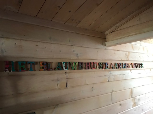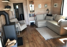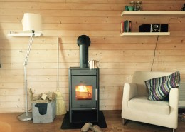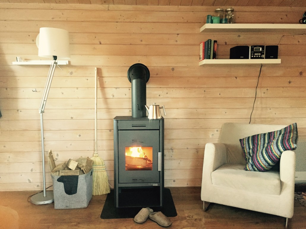 Het huisje heeft een woonruimte met een houtkachel, een eethoek met vier stoelen, een driezits-loungebank en een luie stoel.